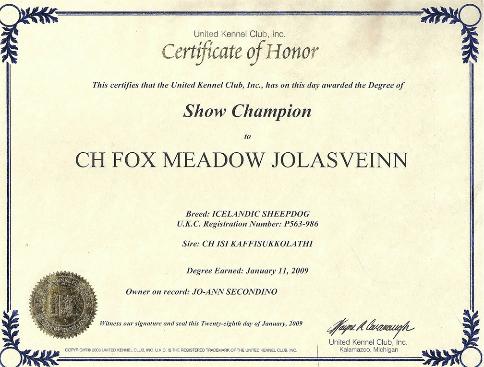 | AKC-CH, International / National Champion UKC-CH Fox Meadow Jolasveinn |